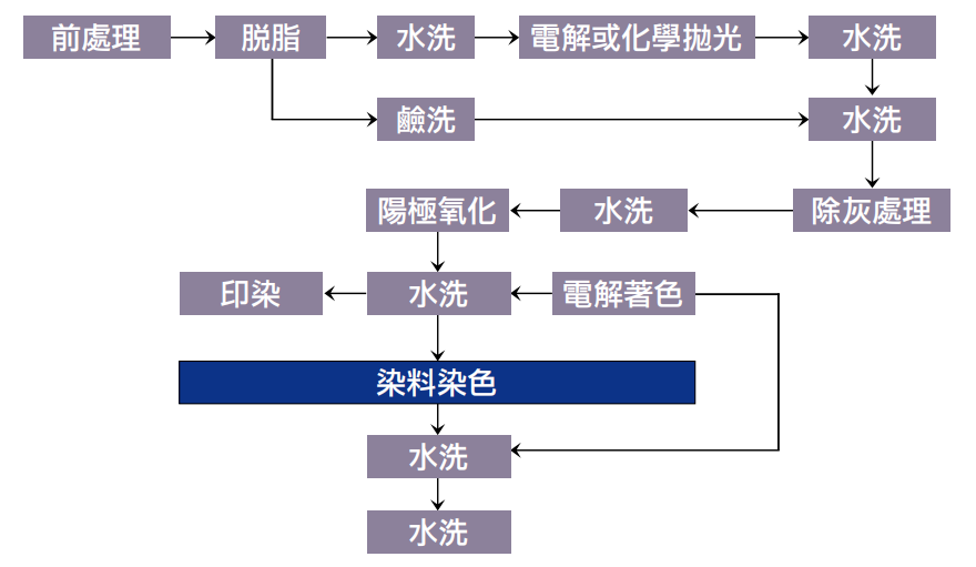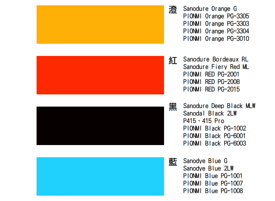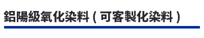 鋁陽級氧化染料有:PIONMI(PG、PL、PS),Clariant(Sanodal、Sanodure、Sanody),OKUNO,7 大系列 300 多種產品。產品具有良好的染色能力,適用於大多數精飾鋁製品。對於在耐光、耐氣候、耐腐蝕等方面也適用。染料色系齊全,使用時顏色穩定,管理方便。